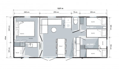 – 1 chambre lit double 160 x 200. – 2 chambres avec 2 lits simples 80 x 190. – Coin repas. Coin cuisine. Salle de bain. – WC. Frigo congélateur. Lave-vaisselle. – Terrasse en bois couverte contemporaine. – TV. Clim. 2 transats. Plancha électrique.