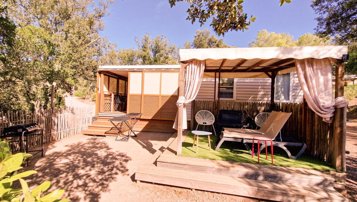 – Terrasse bois intégrée et pergola déportée avec plancha.